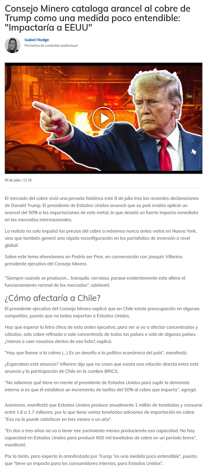 El Consejo Minero advierte que Trump le está regalando a China una ventaja “bastante inexplicable” con aranceles al cobre - (La Tercera Online)