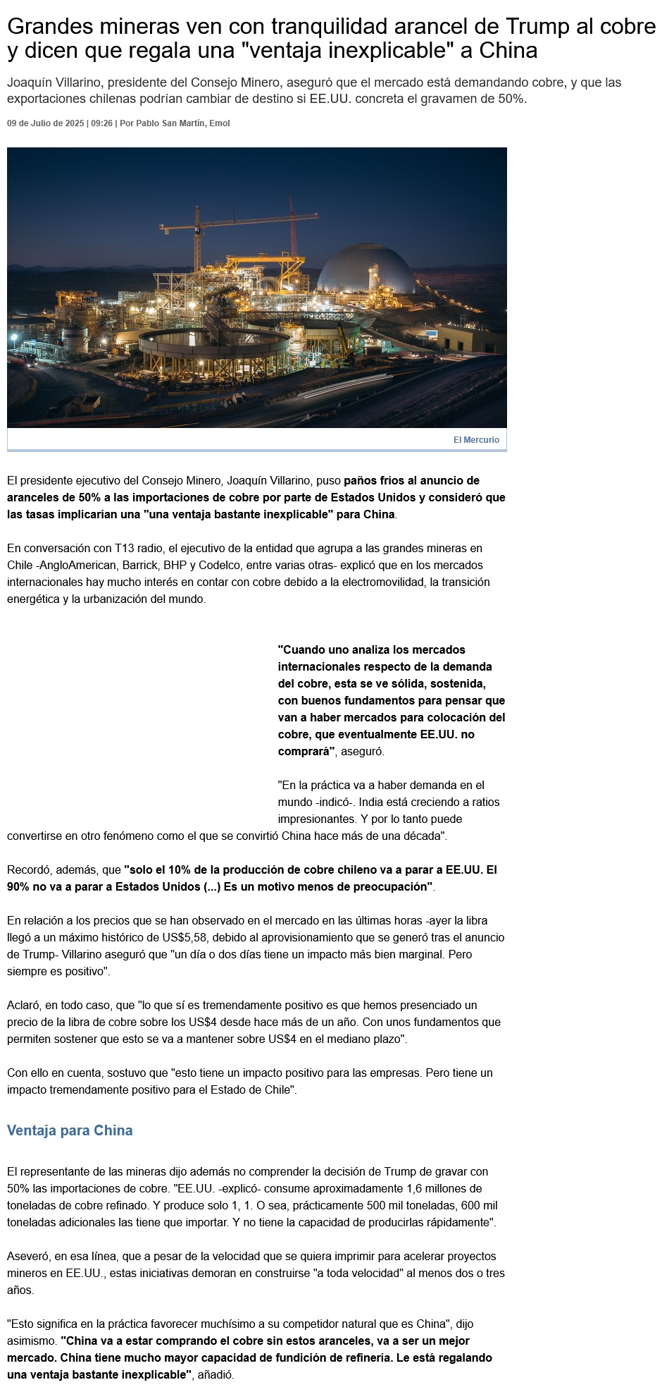 Presidente del Consejo Minero ve con calma arancel de Trump al cobre: Regala una "ventaja inexplicable" a China - (t13.cl)