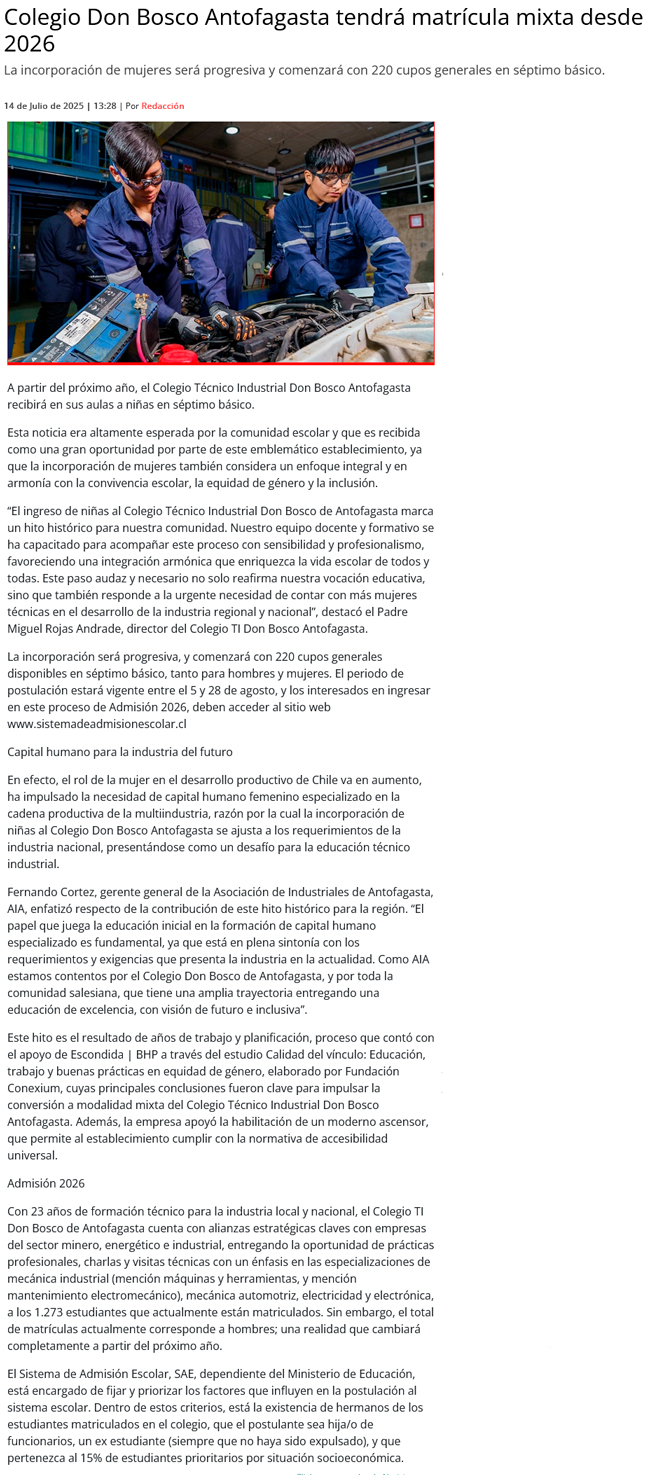 Colegio Técnico Industrial Don Bosco Antofagasta abre sus puertas a niñas desde séptimo básico este 2026 - (reporteminero)