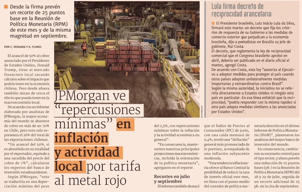 JP Morgan y aranceles al cobre de 50%: “Tendrá repercusiones mínimas en la inflación y actividad económica” en Chile - (Pulso)