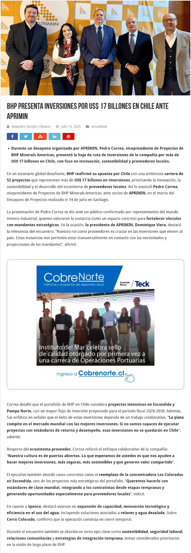 BHP presenta inversiones por US$ 17 billones en Chile ante APRIMIN - (norteonline.cl)
