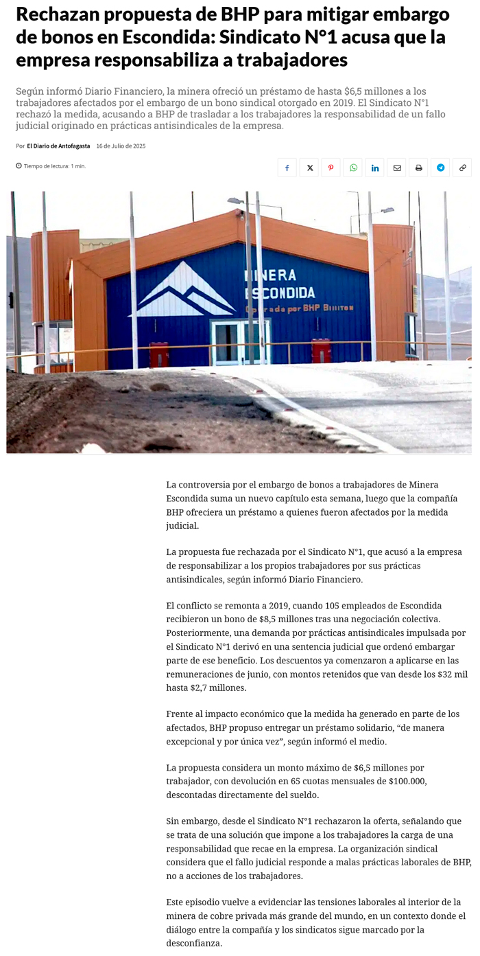 BHP ofrece préstamo a trabajadores afectados por embargo en Escondida y Sindicato N°1 lo rechaza - (soyantofagasta)