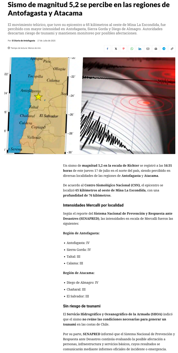 Sismo de mediana intensidad se registró esta tarde en Antofagasta - (timeline)