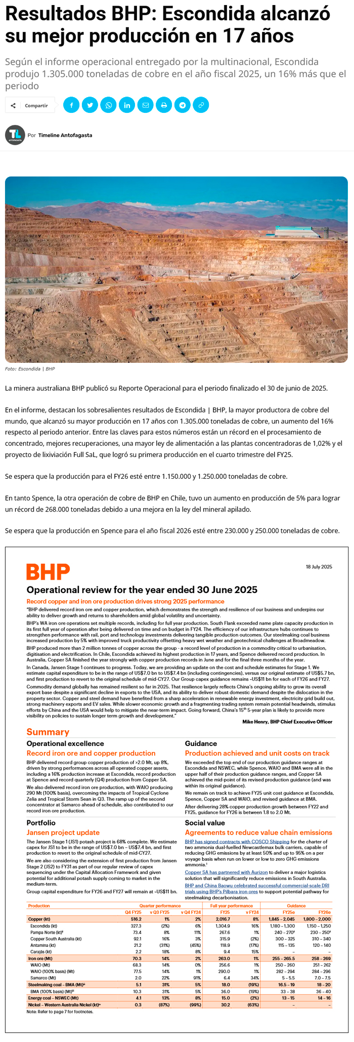 BHP reporta récord histórico en producción de cobre: Escondida fue clave al alcanzar máximo en 17 años - (biobiochile online)