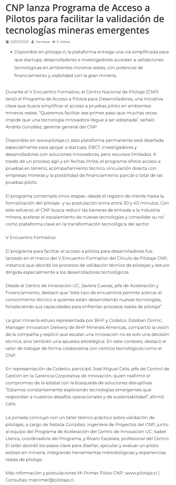 CNP lanza Programa de Acceso a Pilotos para facilitar la validación de tecnologías mineras emergentes - (portalinnova.cl)