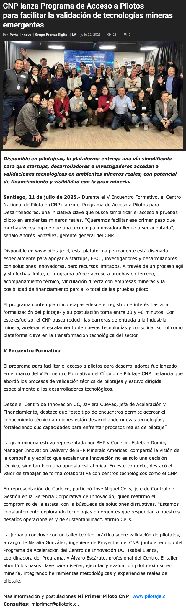 CNP lanza Programa de Acceso a Pilotos para facilitar la validación de tecnologías mineras emergentes - (chanarcillo.cl)