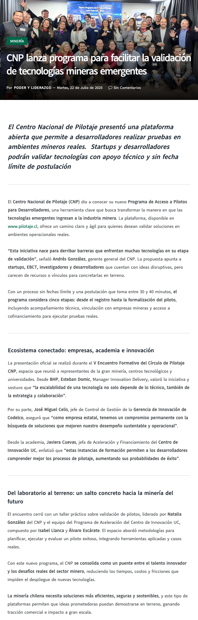 CNP lanza Programa de Acceso a Pilotos para facilitar la validación de tecnologías mineras emergentes - (portalinnova.cl)