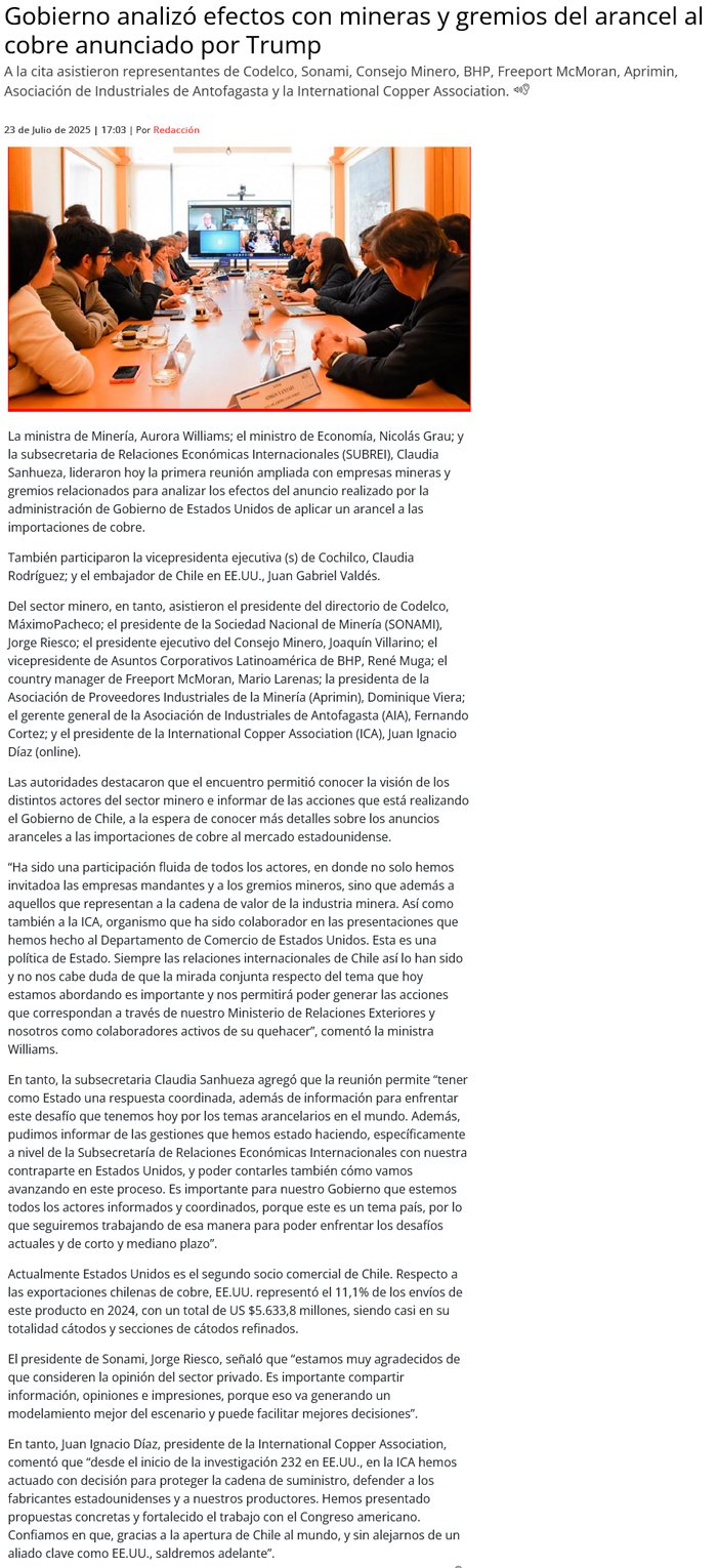 Gobierno realiza reunión ampliada con empresas mineras para analizar medidas comerciales anunciadas por Estados Unidos sobre importaciones de cobre - (antofagastanoticias)