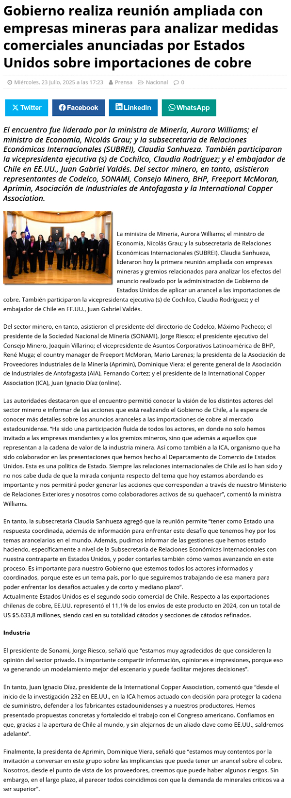 Gobierno realiza reunión ampliada con empresas mineras para analizar medidas comerciales anunciadas por Estados Unidos sobre importaciones de cobre - (antofagastanoticias)