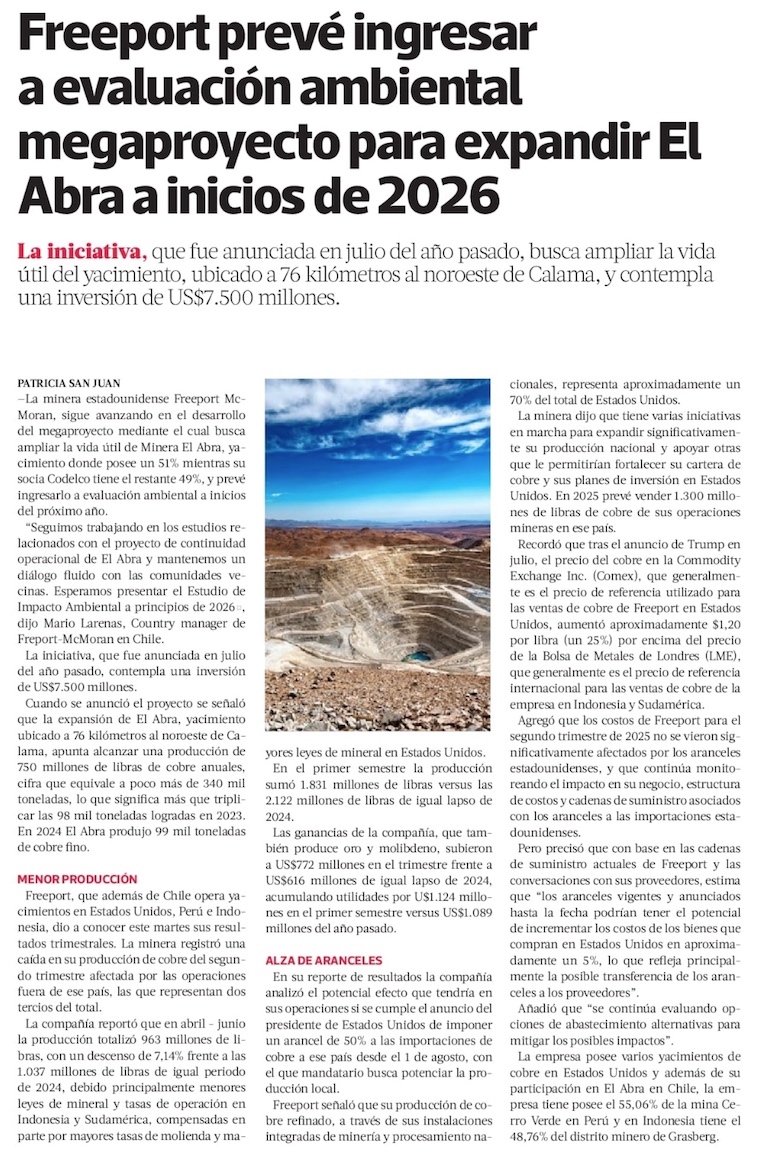 Freeport aplaza ingreso de EIA para expandir El Abra - (El Mercurio de Santiago)
