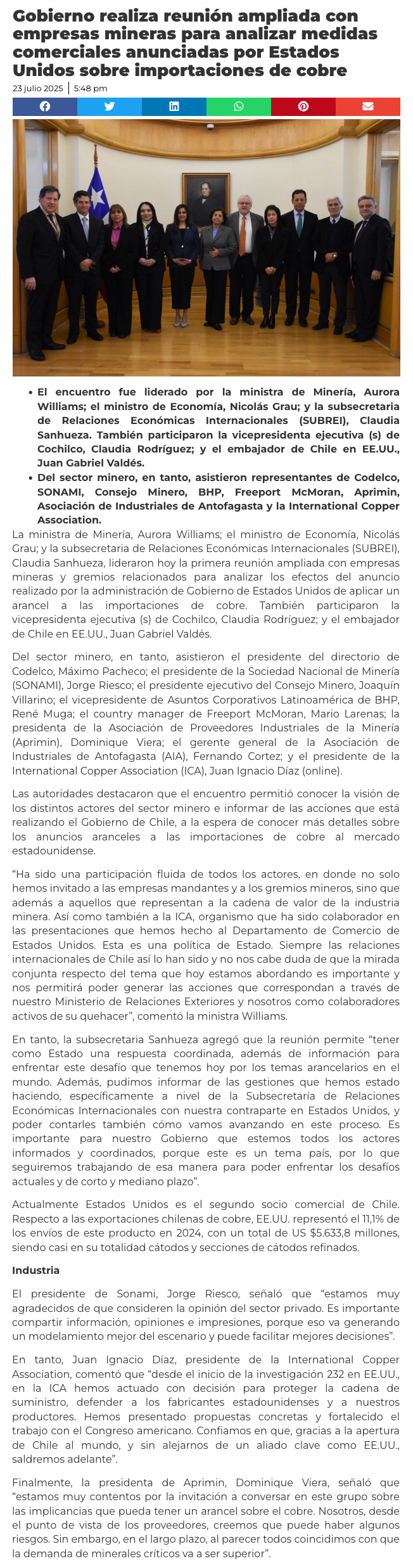 Gobierno realiza reunión ampliada con empresas mineras para analizar medidas comerciales anunciadas por Estados Unidos sobre importaciones de cobre - (antofagastanoticias)
