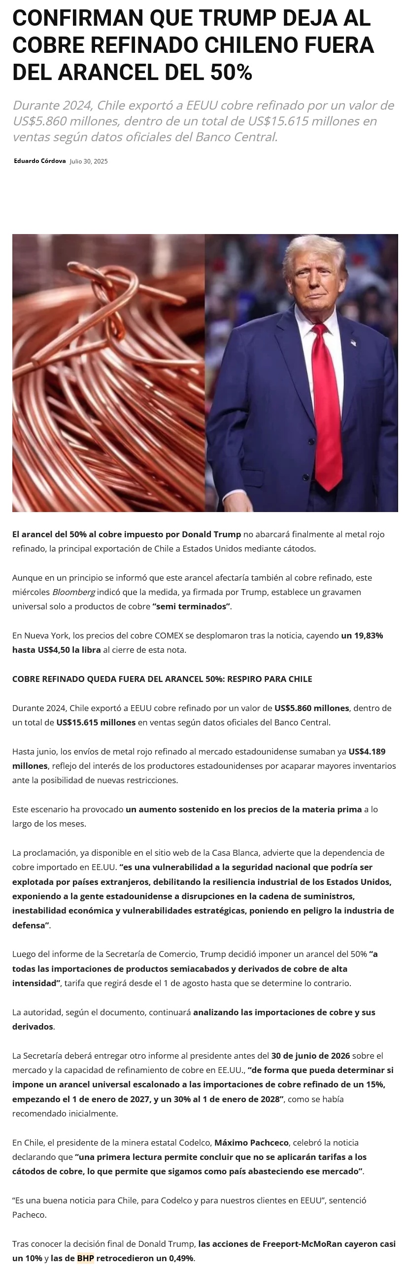 “Cobre chileno está sujeto a 0% de arancel”: Gobierno celebra medida de Trump - (El Día)