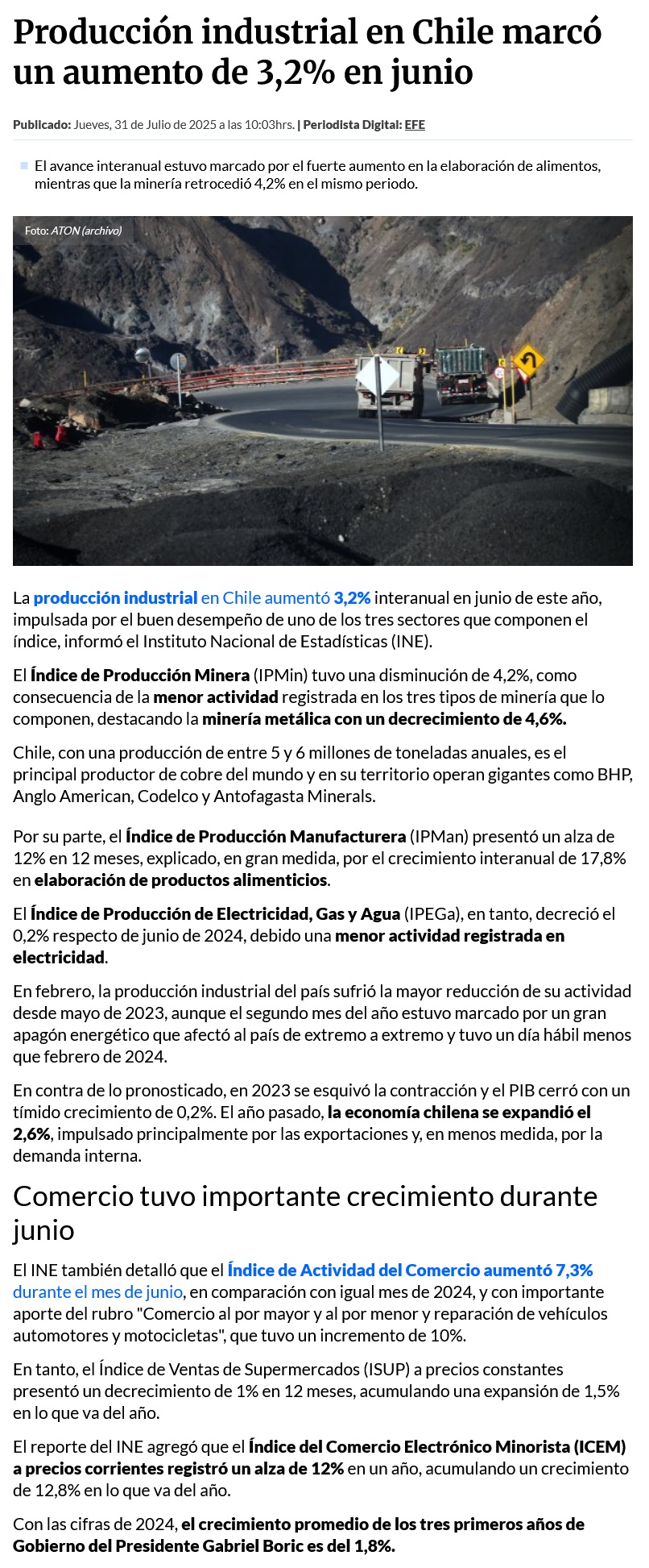 La producción industrial en Chile marca un aumento del 3,2% interanual en junio de 2025 - (eldesconcierto)