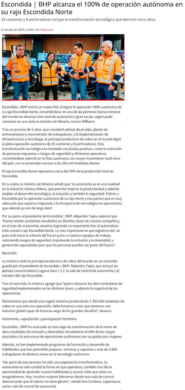 Escondida | BHP anuncia hito tecnológico en el rajo Escondida Norte - (mch.cl)