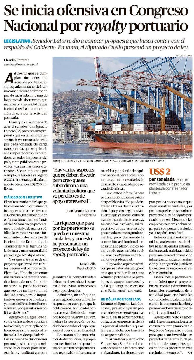 Diputado PC propone royalty a navieras y gremio advierte efectos - (El Mercurio de Santiago)