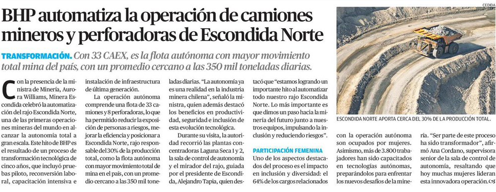 BHP automatiza la operación de camiones mineros y perforadoras de Escondida Norte - (El Mercurio de Calama)