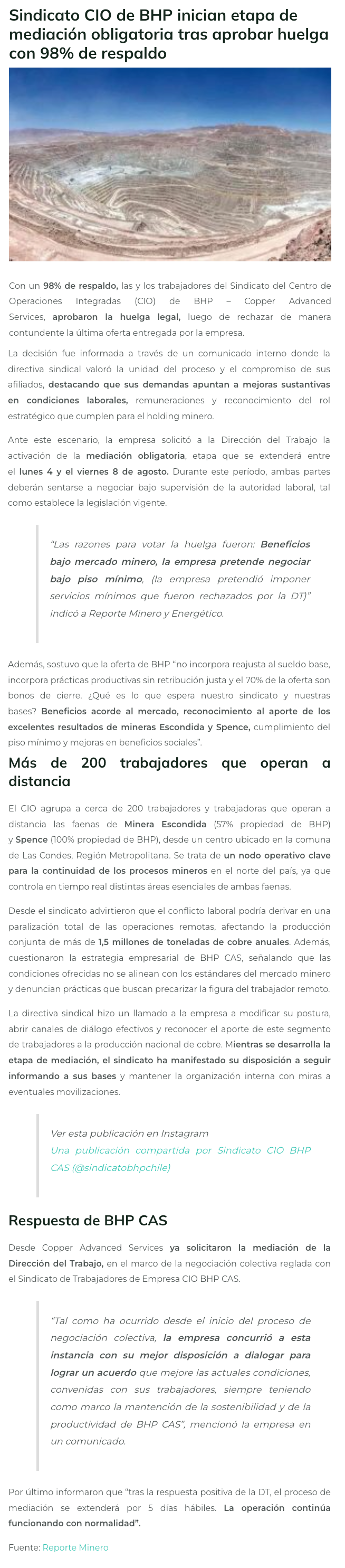 Sindicato CIO de BHP inician etapa de mediación obligatoria tras aprobar huelga con 98% de respaldo - (portalinnova.cl)