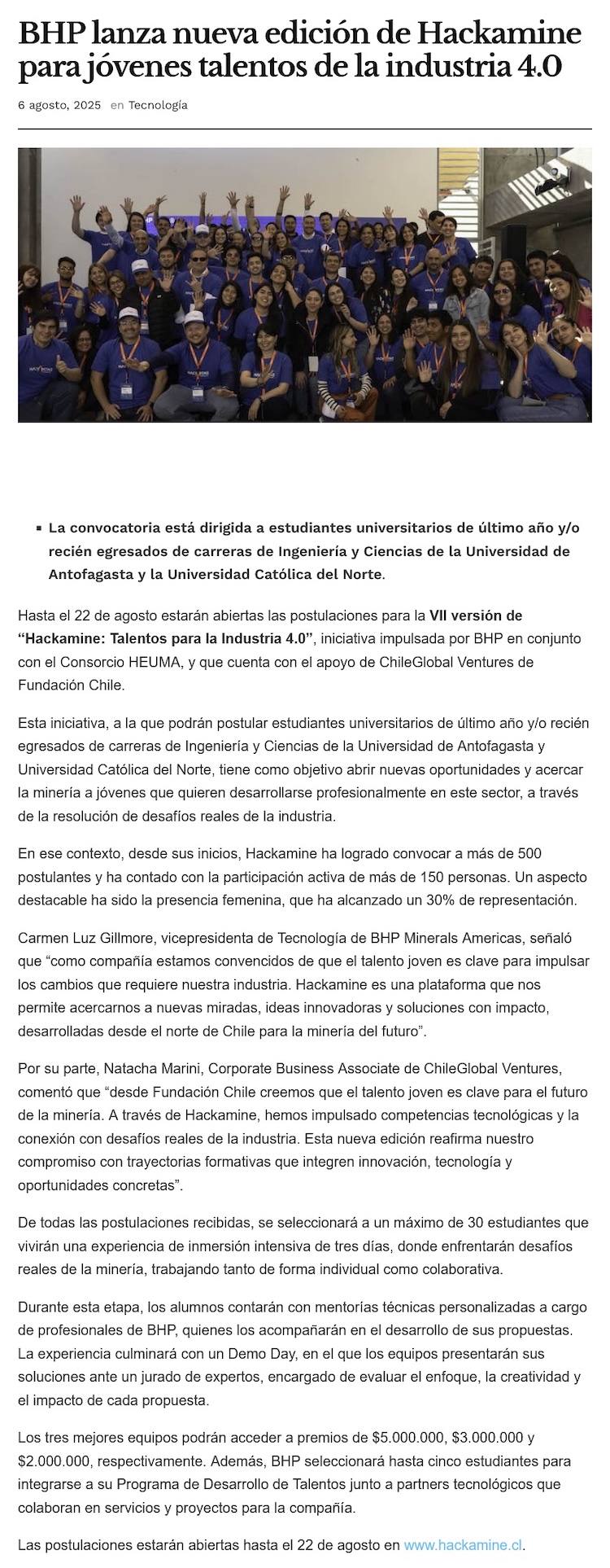 Hasta el 22 de agosto estarán abiertas postulaciones para hackamine de BHP para jóvenes talentos - (soyantofagasta)