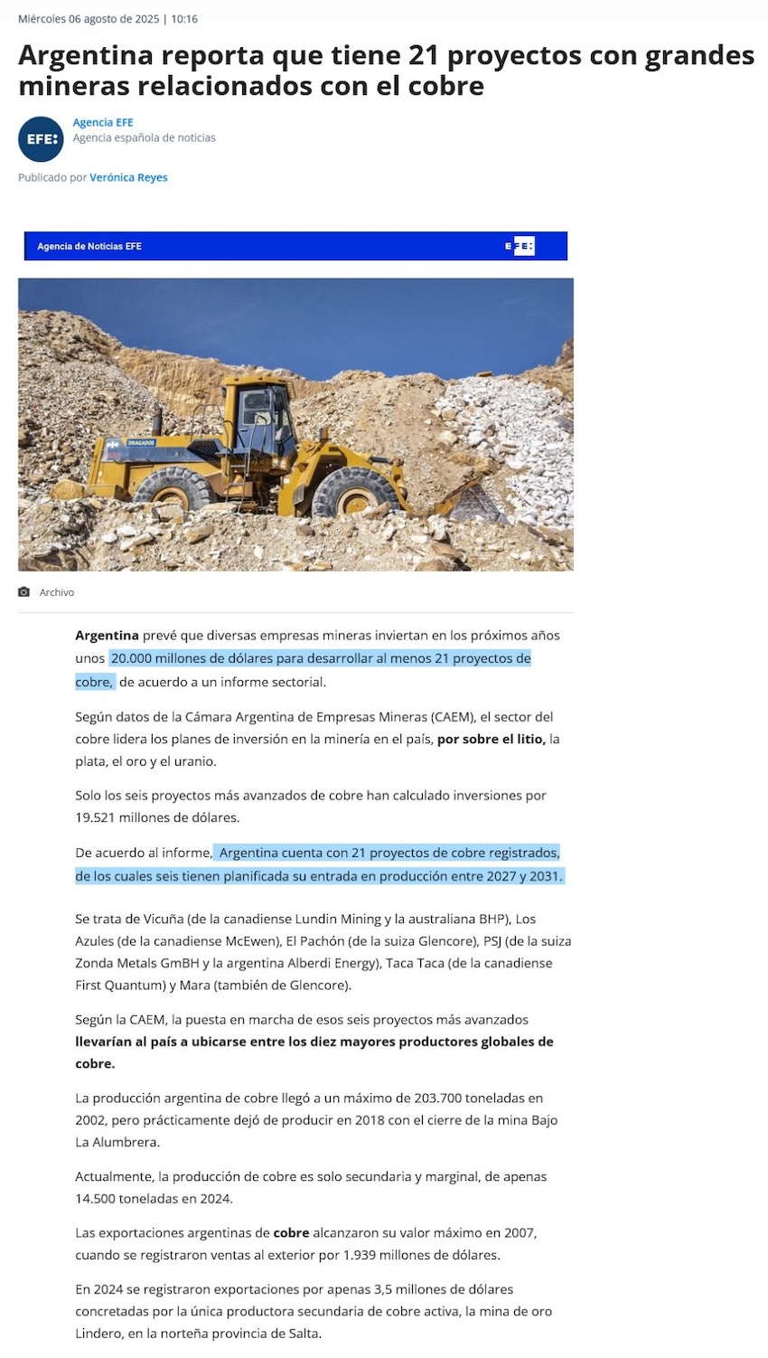 Argentina impulsa 21 proyectos mineros de cobre con inversiones millonarias - (redimin)