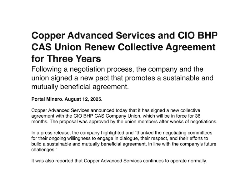 Copper Advanced Services Signs New Collective Agreement with CIO BHP CAS Union - (mineriayfuturo.cl)