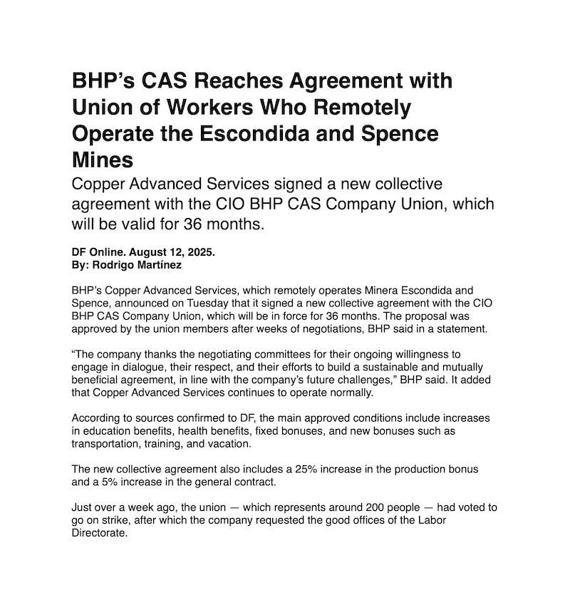 Union That Remotely Operates Escondida and Spence Reaches Agreement with BHP Copper Advanced Services (CAS) - (diarioantofagasta)