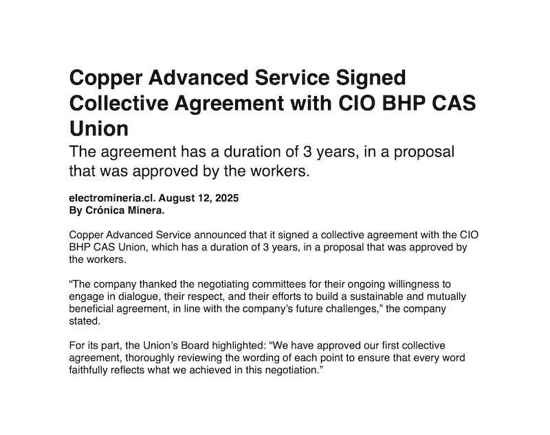 Copper Advanced Services Signs New Collective Agreement with CIO BHP CAS Union - (mineriayfuturo.cl)