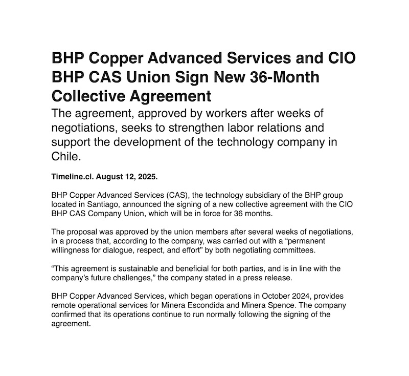 Union That Remotely Operates Escondida and Spence Reaches Agreement with BHP Copper Advanced Services (CAS) - (diarioantofagasta)
