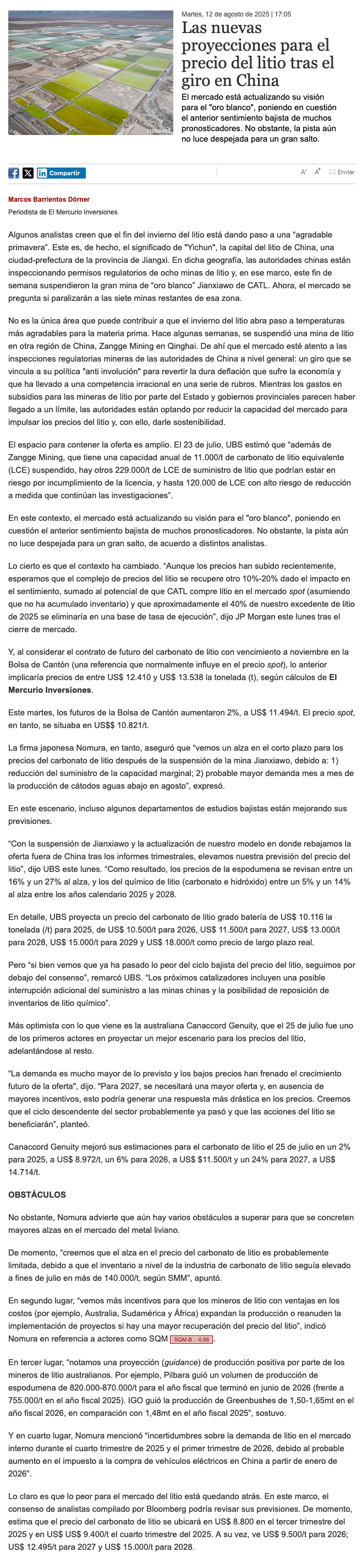 Las nuevas proyecciones para el precio del litio tras el giro en China - (El Mercurio de Santiago)