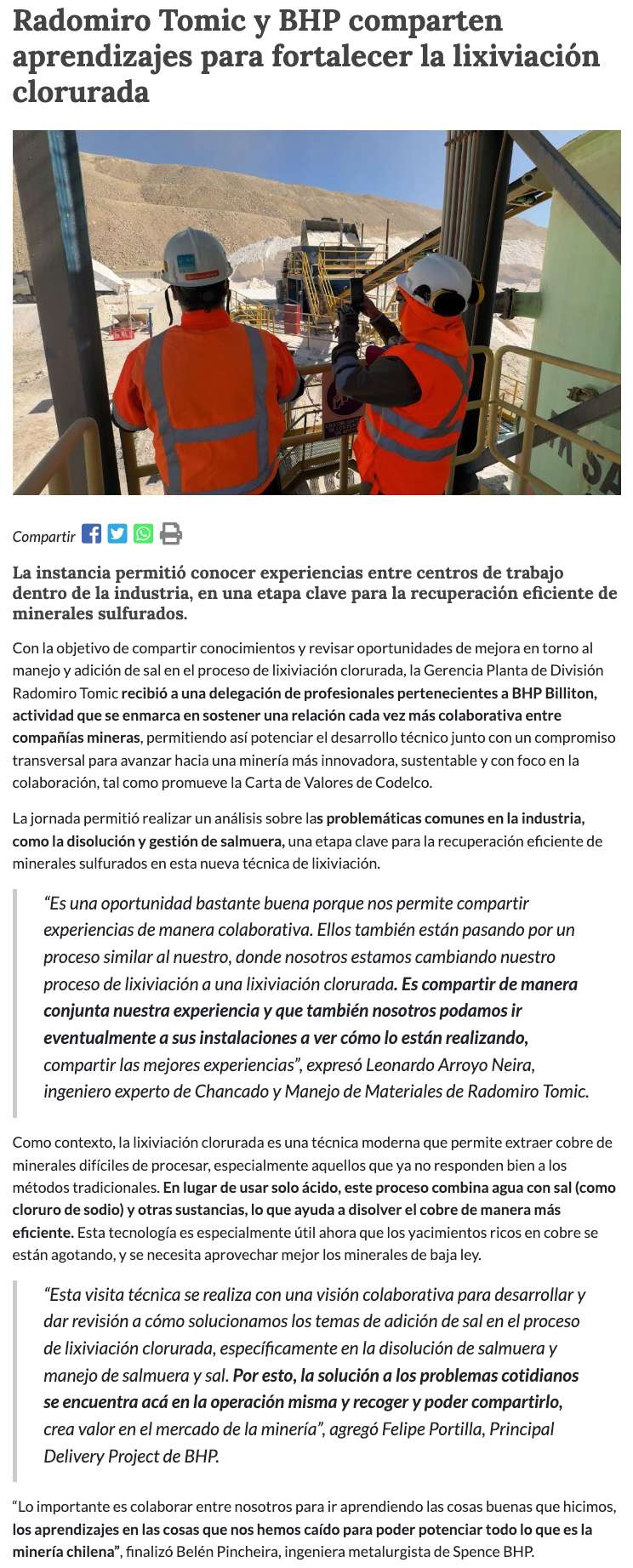 Radomiro Tomic y BHP comparten aprendizajes para fortalecer la lixiviación clorurada - (nuevaminería online)
