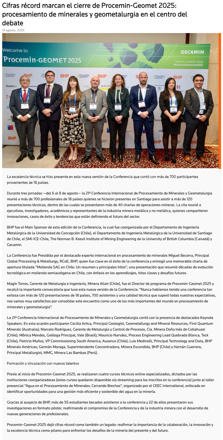 Cifras récord marcan el cierre de Procemin-Geomet 2025: procesamiento de minerales y geometalurgia en el centro del debate - (portalinnova.cl)