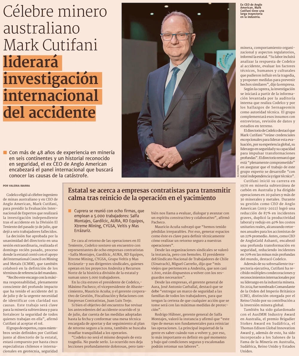 Directorio de Codelco nombra a Mark Cutifani para presidir evaluación independiente sobre el accidente en El Teniente - (mvcomunicaciones.cl)