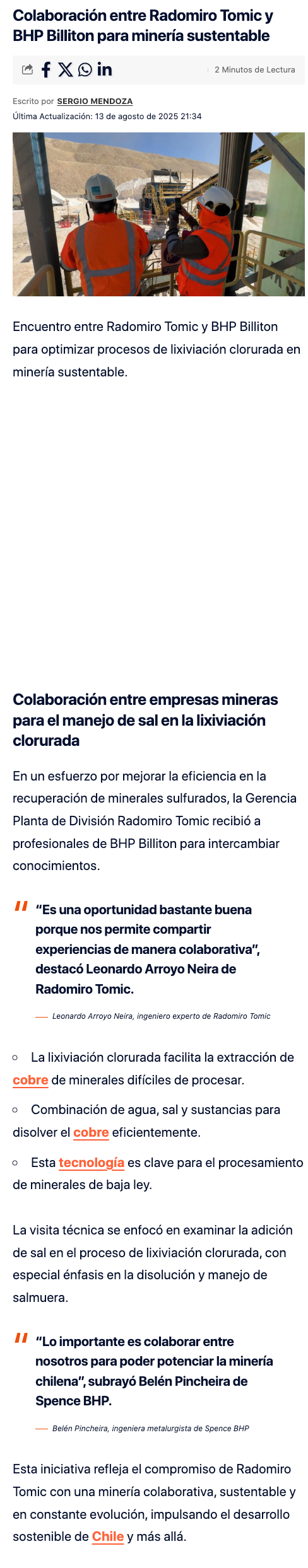 Radomiro Tomic y BHP comparten aprendizajes para fortalecer la lixiviación clorurada - (nuevaminería online)