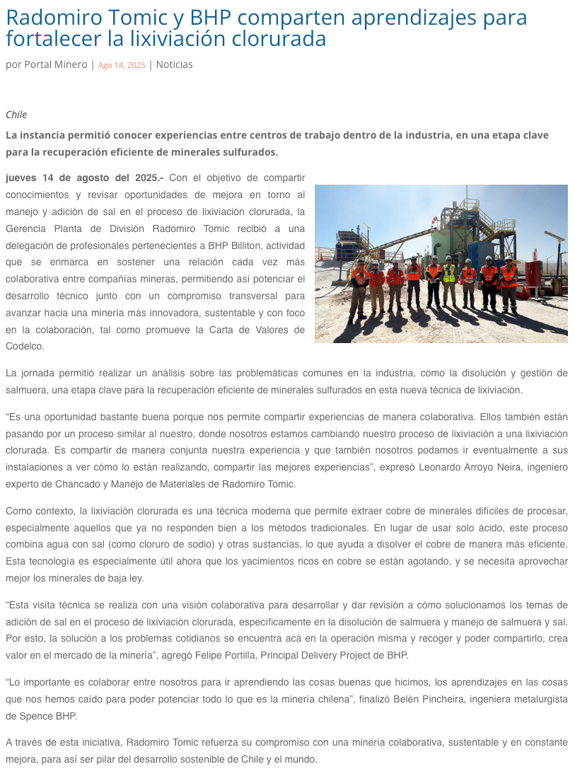 Radomiro Tomic y BHP comparten aprendizajes para fortalecer la lixiviación clorurada - (mch.cl)