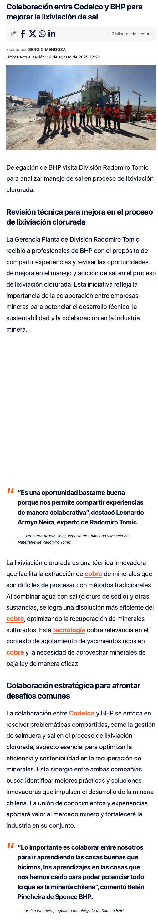 Codelco y BHP fortalecen colaboración para optimizar la lixiviación clorurada - (mineriayfuturo.cl)