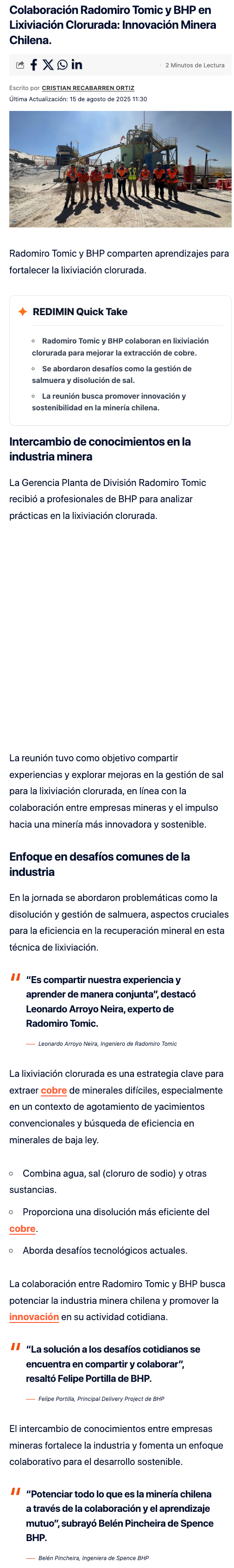 Radomiro Tomic y BHP comparten aprendizajes para fortalecer la lixiviación clorurada - (mch.cl)