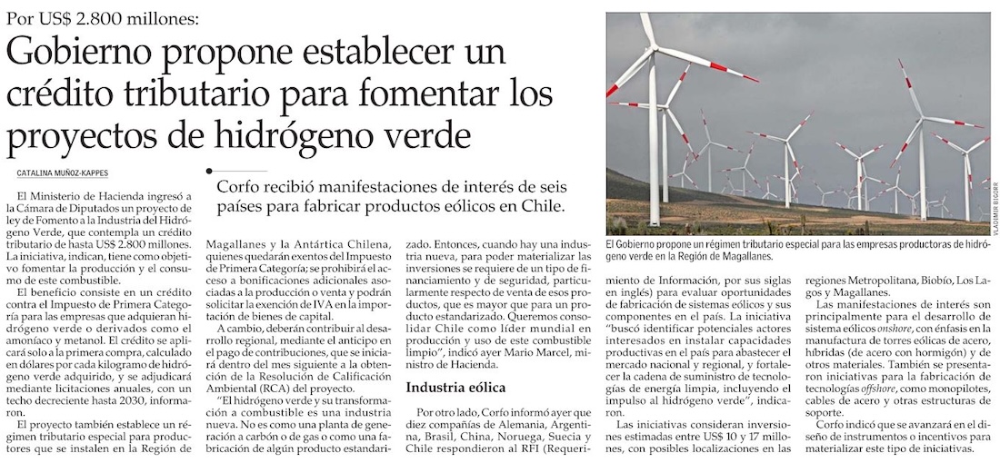Gobierno ingresa proyecto con incentivo tributario para compras de hidrógeno verde - (Diario Financiero)