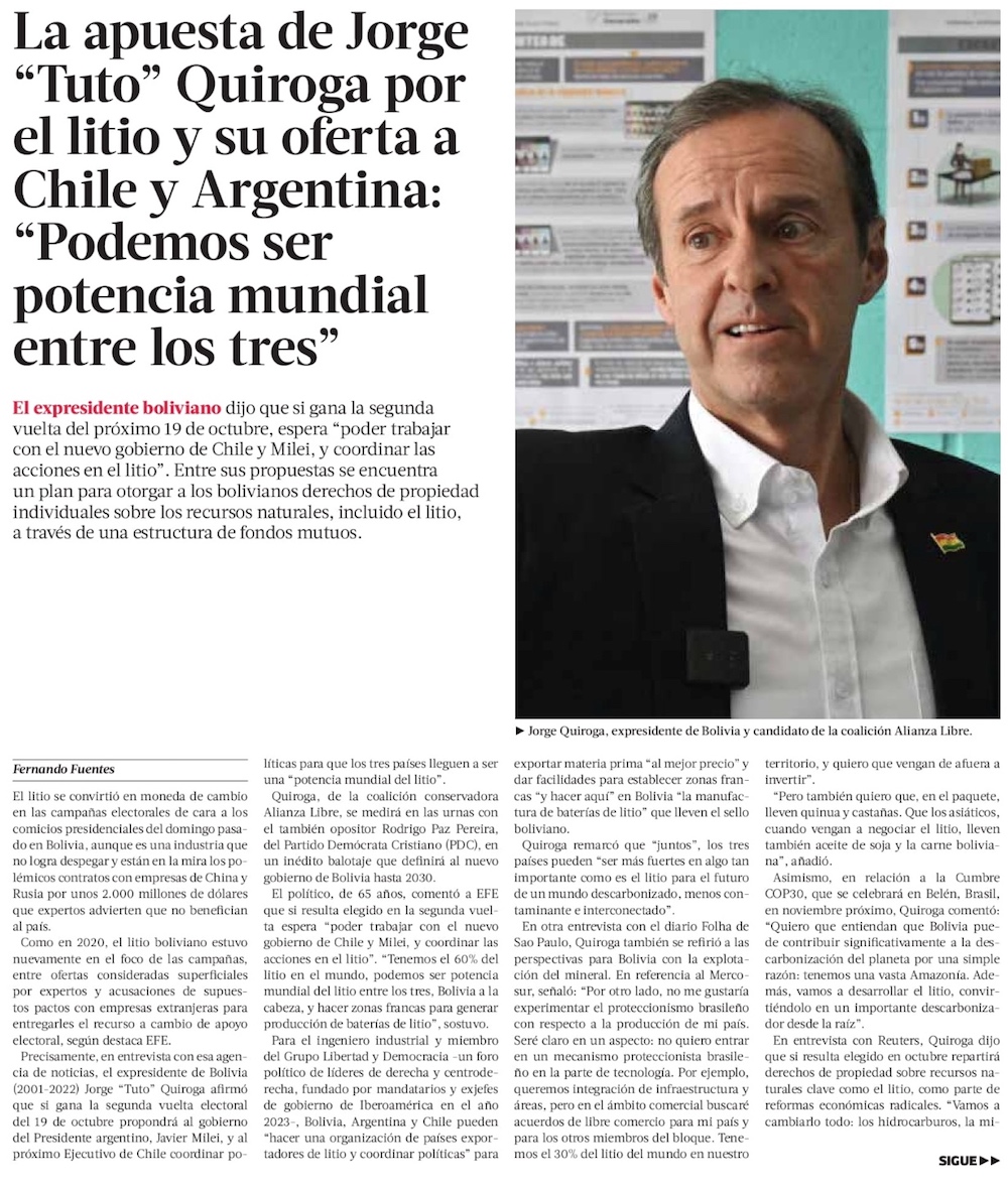 Quiroga planteará a Milei y Chile coordinar plan sobre el litio - (El Mercurio de Santiago)