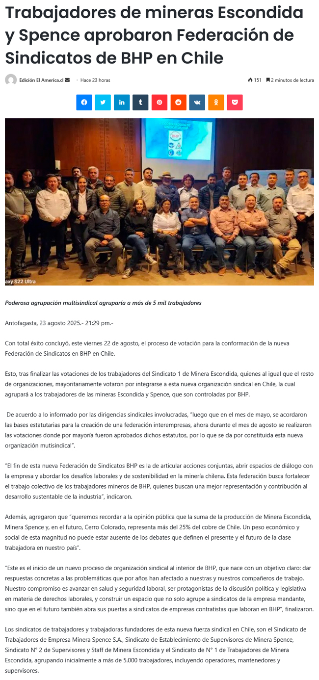 Trabajadores de Escondida y Spence aprueban creación de nueva Federación de Sindicatos de BHP en Chile - (soyantofagasta)