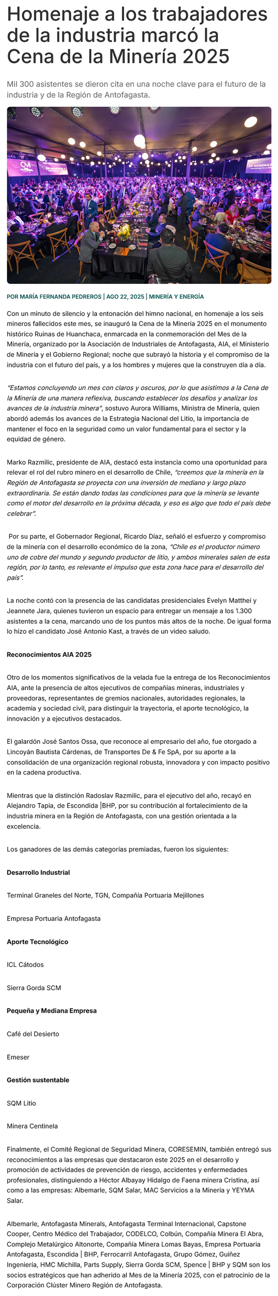 Cena de la Minería 2025: La industria realiza un reconocimiento a sus trabajadores - (mch.cl)