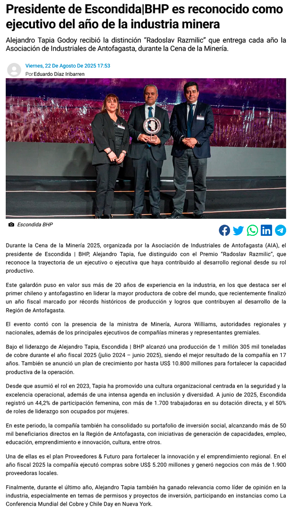 Antofagasta celebra a Alejandro Tapia: presidente de Escondida es reconocido como ejecutivo del año en la minería - (madero.cl)