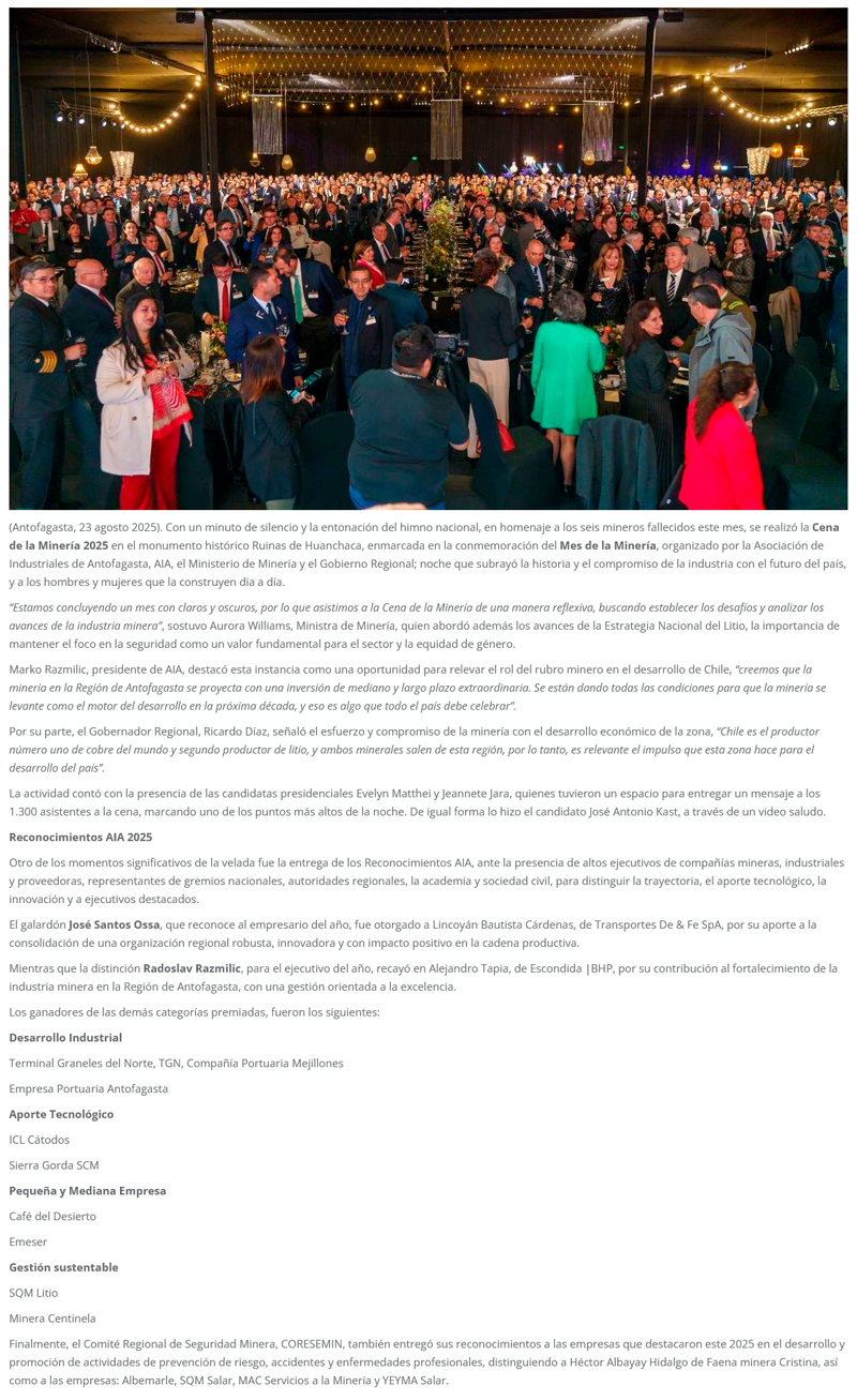 Cena de la Minería 2025: La industria realiza un reconocimiento a sus trabajadores - (mch.cl)