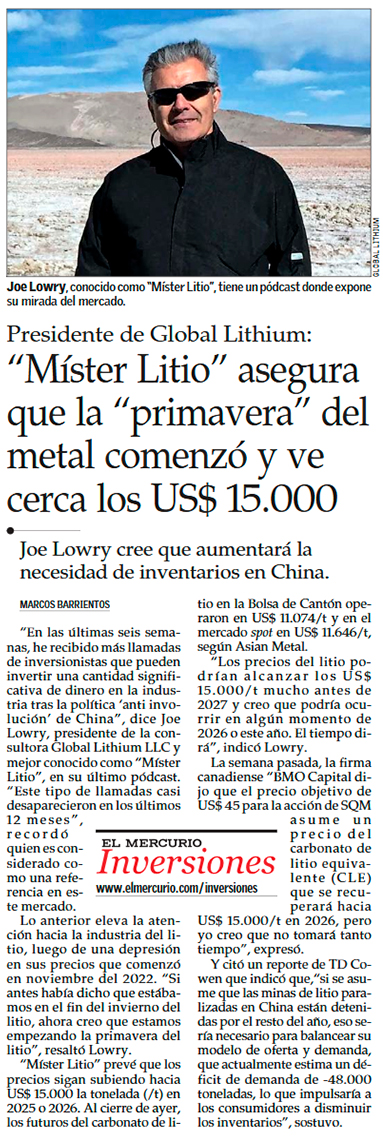 "Míster Litio" asegura que la "primavera" del metal ya comenzó y ve cerca los US$15.000 - (El Mercurio Inversiones)