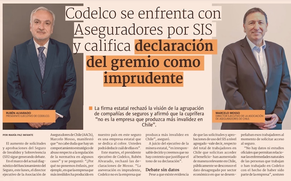 Codelco refuta a las aseguradoras y afirma que “no es la empresa que produzca más invalidez en Chile” - (Pulso)