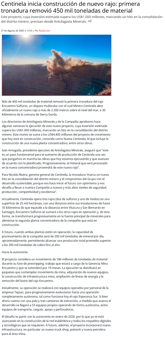 Centinela abre nuevo rajo Encuentro Sulfuros que involucra inversión de US$1.000 millones - (El Mercurio de Antofagasta)