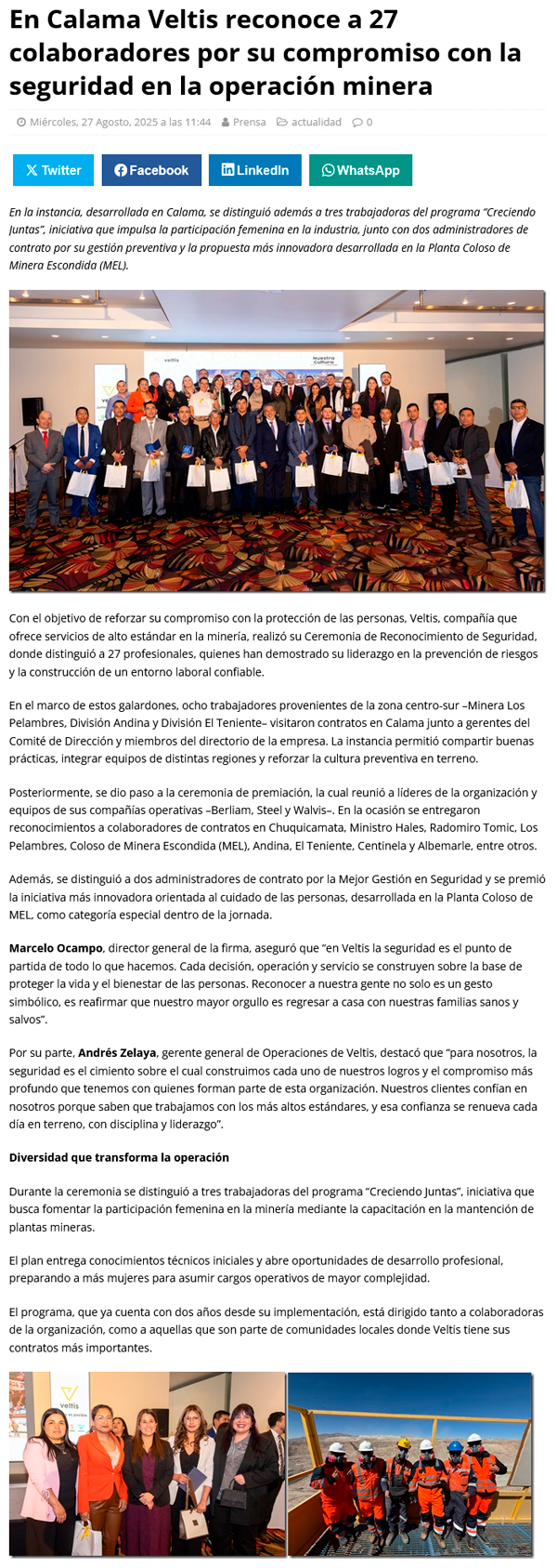 En Calama Veltis reconoce a 27 colaboradores por su compromiso con la seguridad en la operación minera - (antofagastanoticias)