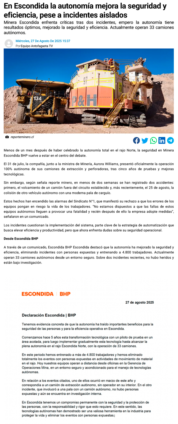 Escondida defiende seguridad de su flota autónoma ante críticas de Sindicato 1 - (norteonline.cl)
