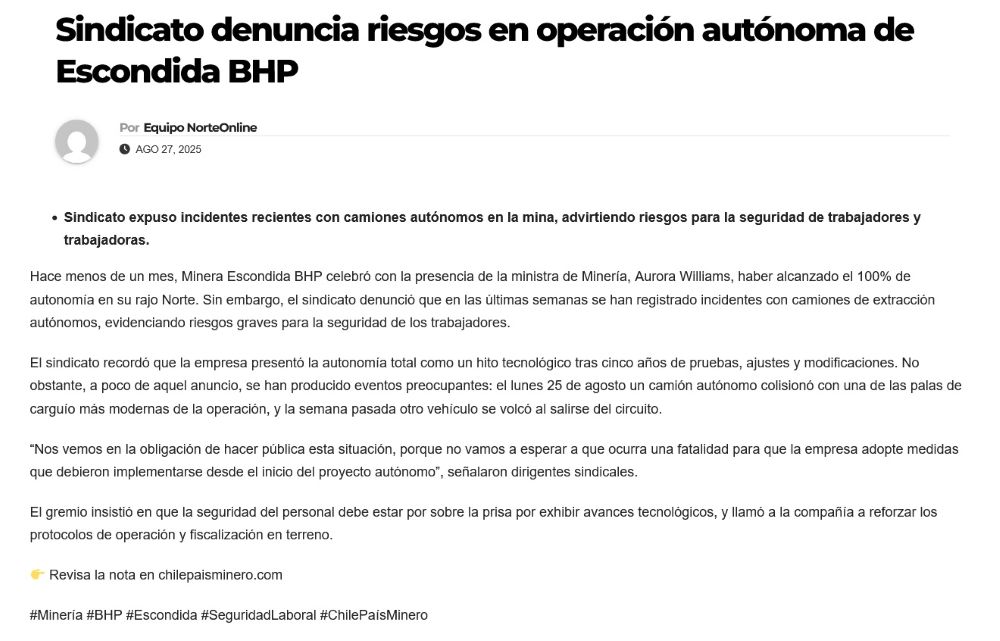 Sindicato de Escondida advierte sobre riesgos de seguridad tras accidentes con camiones autónomos - (mineriayfuturo.cl)