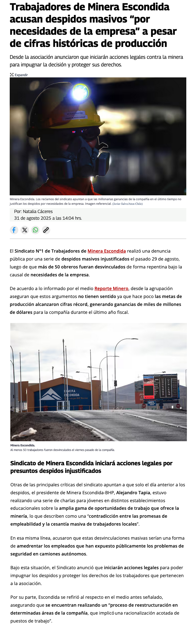 Sindicato N°1 denuncia más de 50 trabajadores despedidos en Escondida y anuncia recursos para revertir medida - (soyantofagasta)