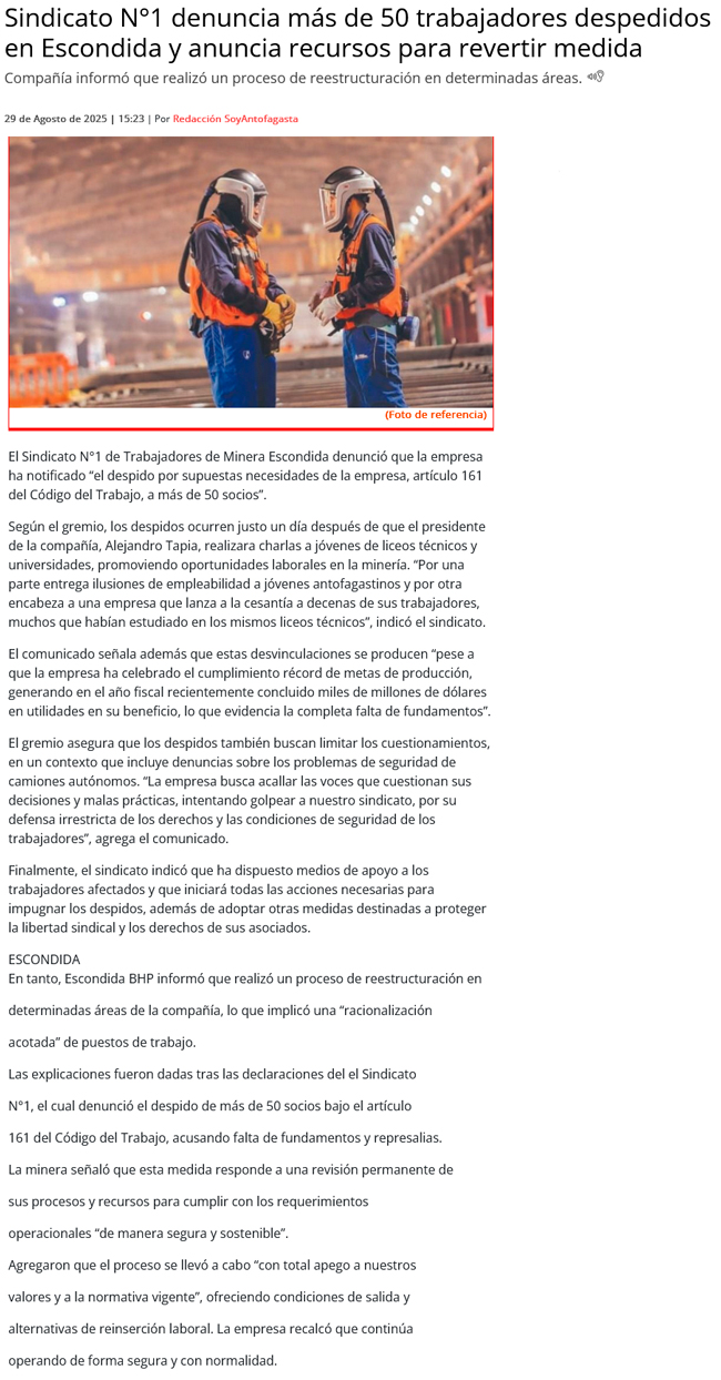 Sindicato denuncia despido de 50 trabajadores en Minera Escondida - (antofagasta.tv)