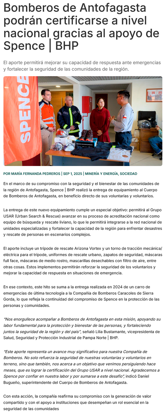 Grupo de Rescate de Bomberos de Antofagasta podrá certificarse nacionalmente gracias a nuevo equipamiento entregado por Spence | BHP - (timeline)